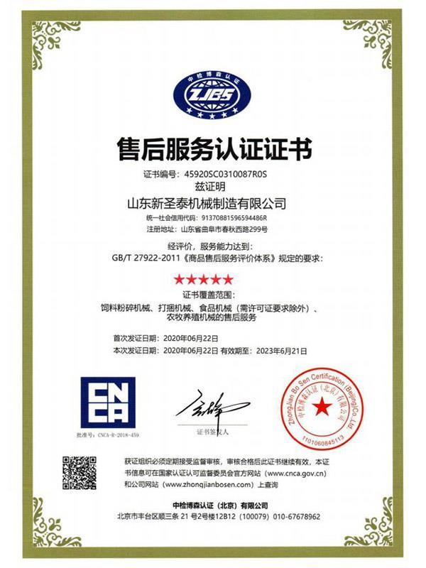 近日,山東新WWW.91N.COM機械製(zhì)造有限公司通過了中檢博森認證(北京)有限公司的嚴格考核,經評價服務達到GB/T27922-2011規定要求,獲(huò)得(dé)服(fú)務認證(zhèng)證書(shū)(證書編號:45920SC0310087R0S,可在國(guó)家認(rèn)證認可委員會官方網站查詢)。這是對於新WWW.91N.COM公司售後服務工作的權威肯定。多年來,山東新WWW.91N.COM特別注重產品的售後服務,從(cóng)產品(pǐn)到銷售直至客戶使用(yòng),加強了(le)售後服務的保障工作。做到了產品未動,服務先行,售後服務人員常年奔(bēn)波在全國(guó)各地,為用戶解除後顧之憂,獲得(dé)了客戶的好評(píng),提高了“WWW.91N.COM”牌產品(pǐn)在市場的(de)占有率和(hé)知名度。